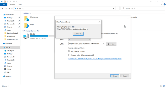 - Once you click Finish, you will be connected to your server and asked to enter your login credentials to finish WebDAV setup.
