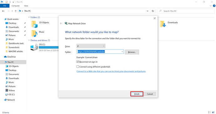 For example: https://SERVERNAME/webdav. - Check the box for Reconnect at sign-in and click Finish.