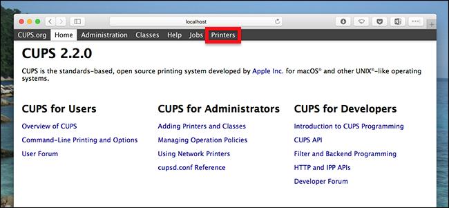 Open your preferred web browser and, navigate to http://localhost:631 and click on Printers. When prompted for a username and password, type the ones you use to access your Mac.