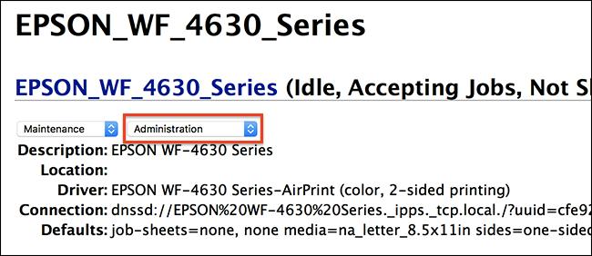 1. Choose the printer for which you wish to update the settings. Select Administration from the drop-down option.