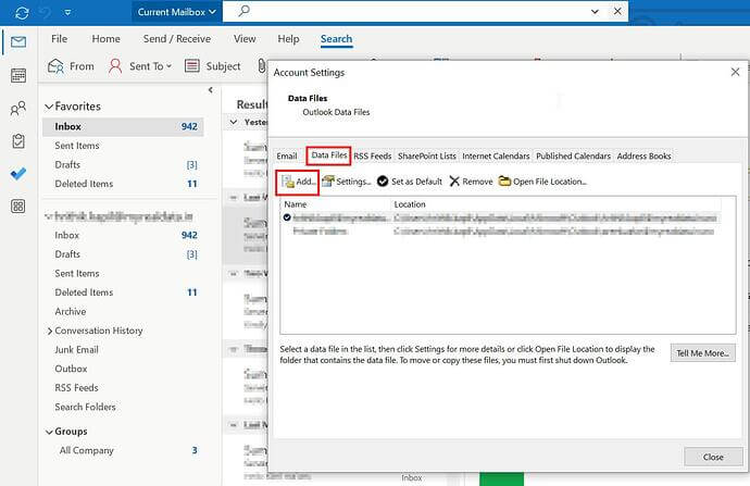 Step 3: Select Data Files tab, then choose Add option to add a .pst file to Outlook.