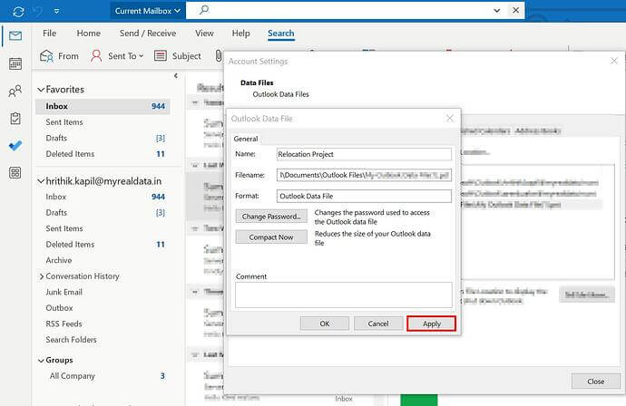 To edit the display name, type a name in the Name box while choosing the Outlook Data File (.pst) in Step 4, then click Apply.