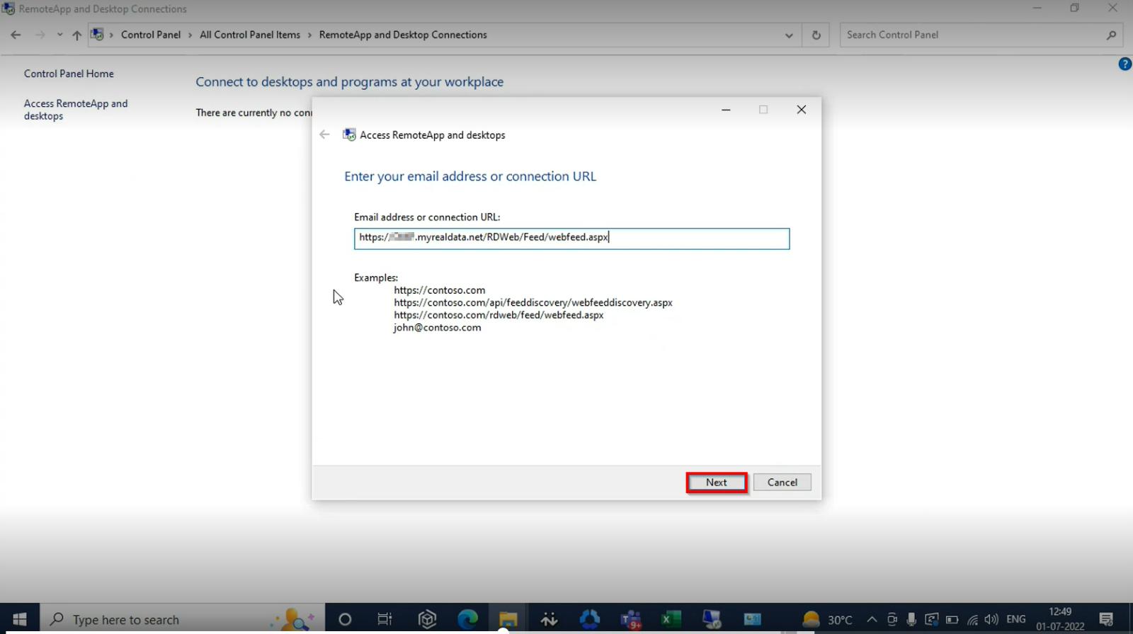 4. Type https://SERVERNAME.myrealdata.net/RDWeb/Feed/webfeed.aspx in the Email address or connection URL box and click Next.